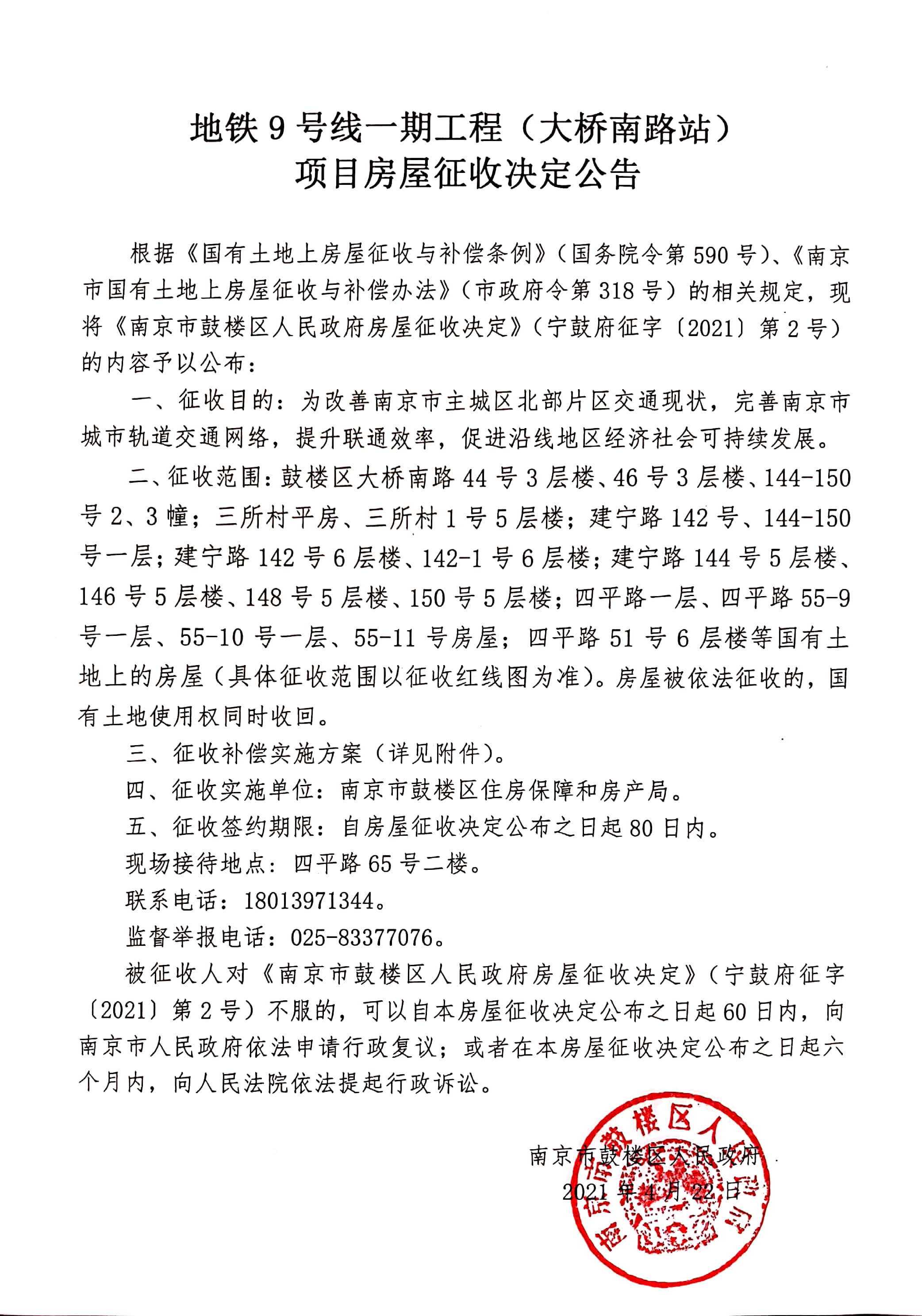信息名稱:    南京地鐵9號線一期工程(大橋南路站)房屋征收決定及公告