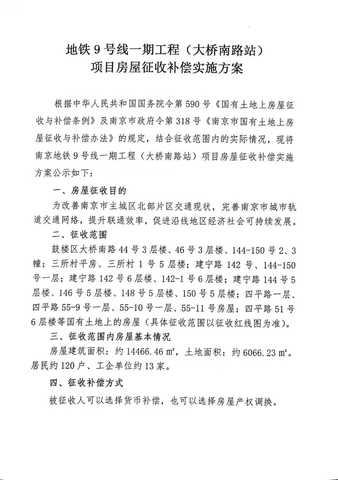 南京地鐵9號線一期工程(大橋南路站)房屋征收決定及公告
