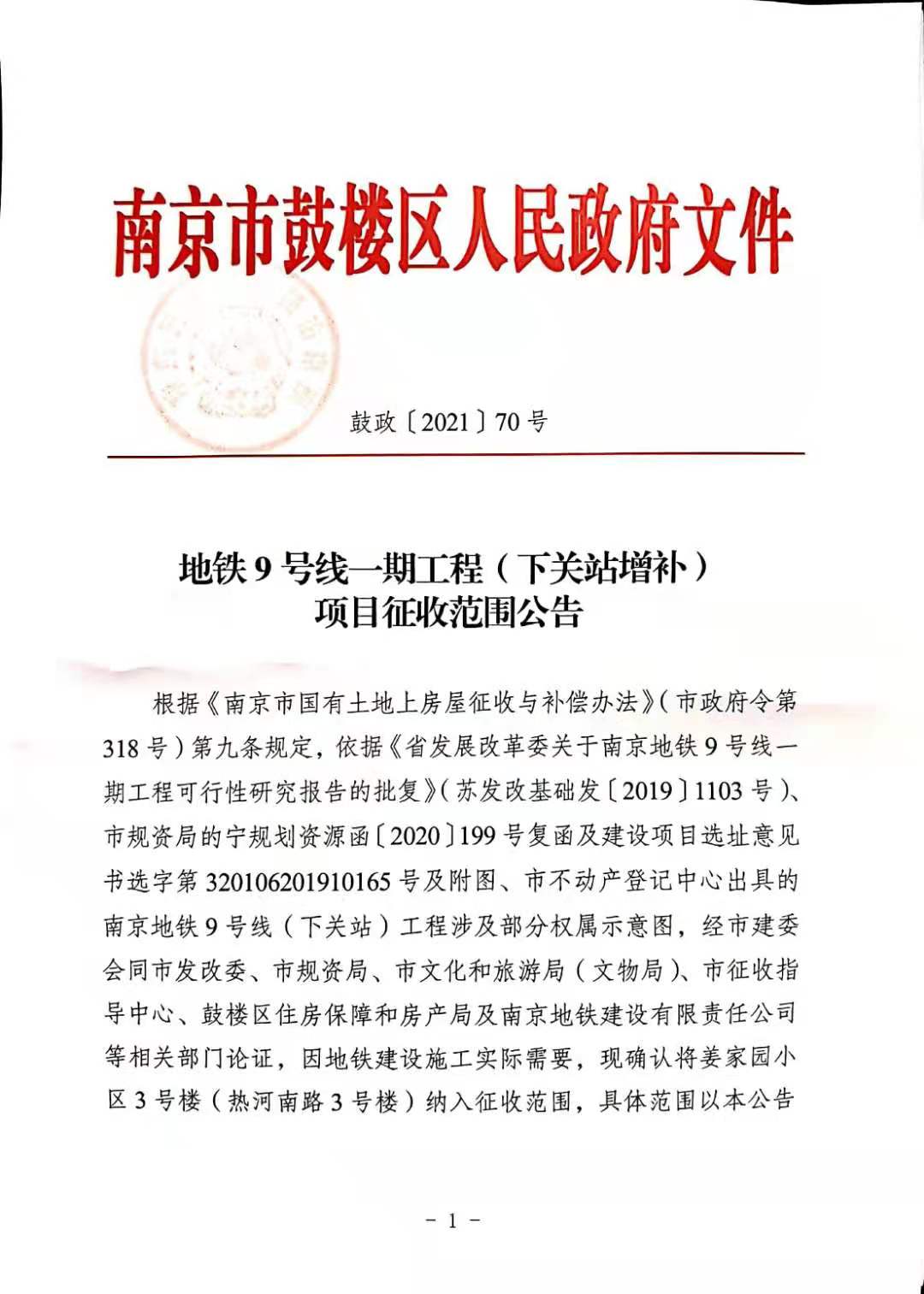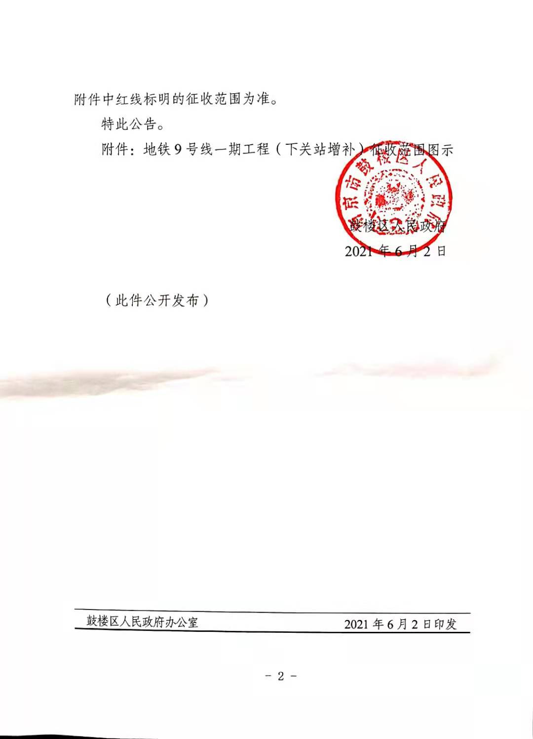 南京地鐵9號線一期工程(下關站增補)征收范圍公告