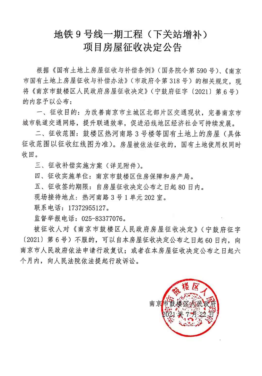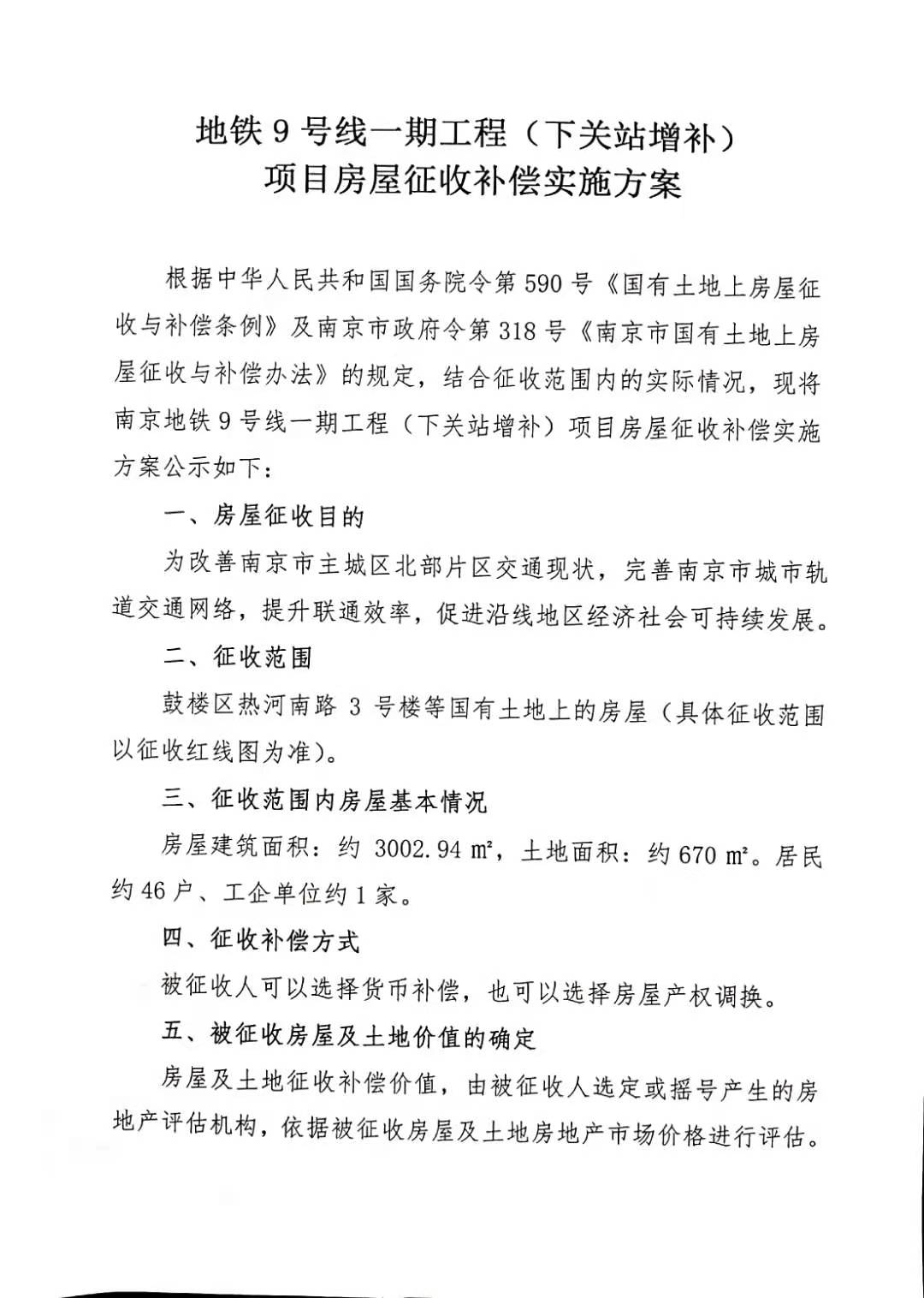 地鐵9號線一期工程(下關站增補)房屋征收決定及公告