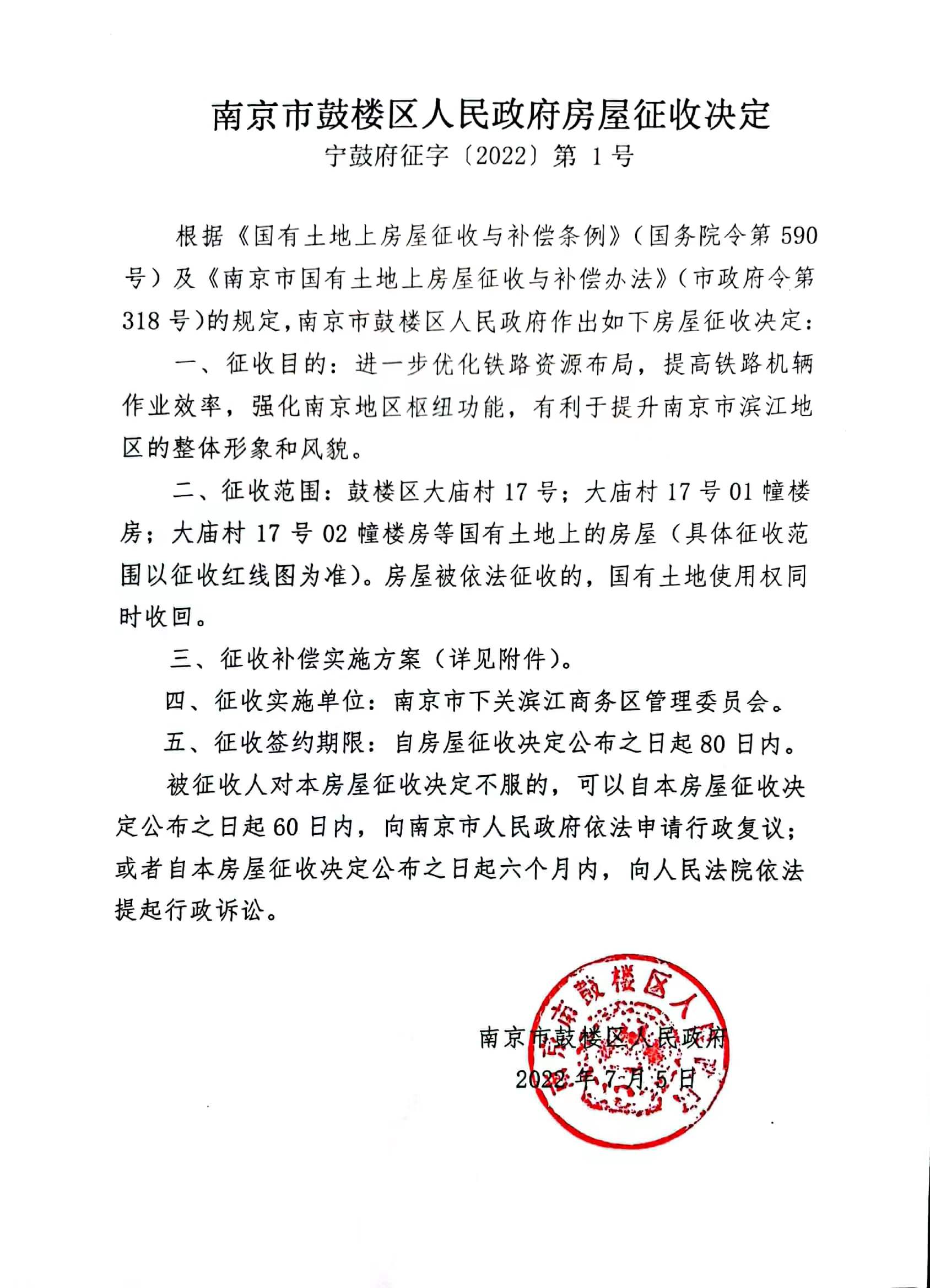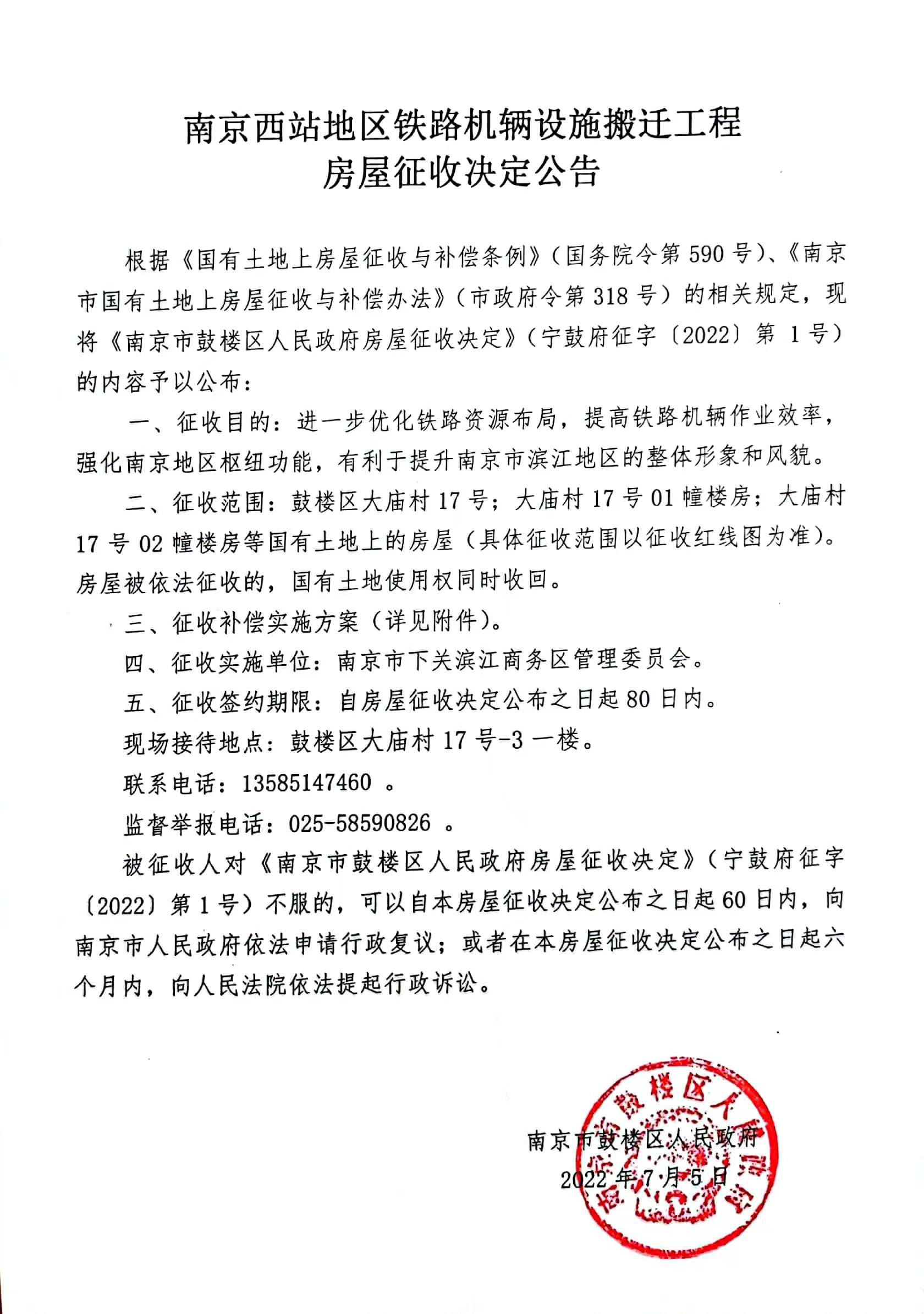 南京西站地區鐵路機輛設施搬遷工程房屋征收決定公告