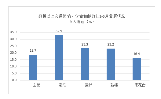 2024年1-5月鼓樓區36家區級核算規模以上交通運輸、倉儲和郵政業企業,實現營業收入48.42億元,同比增長23.2%,五城區排名第三。