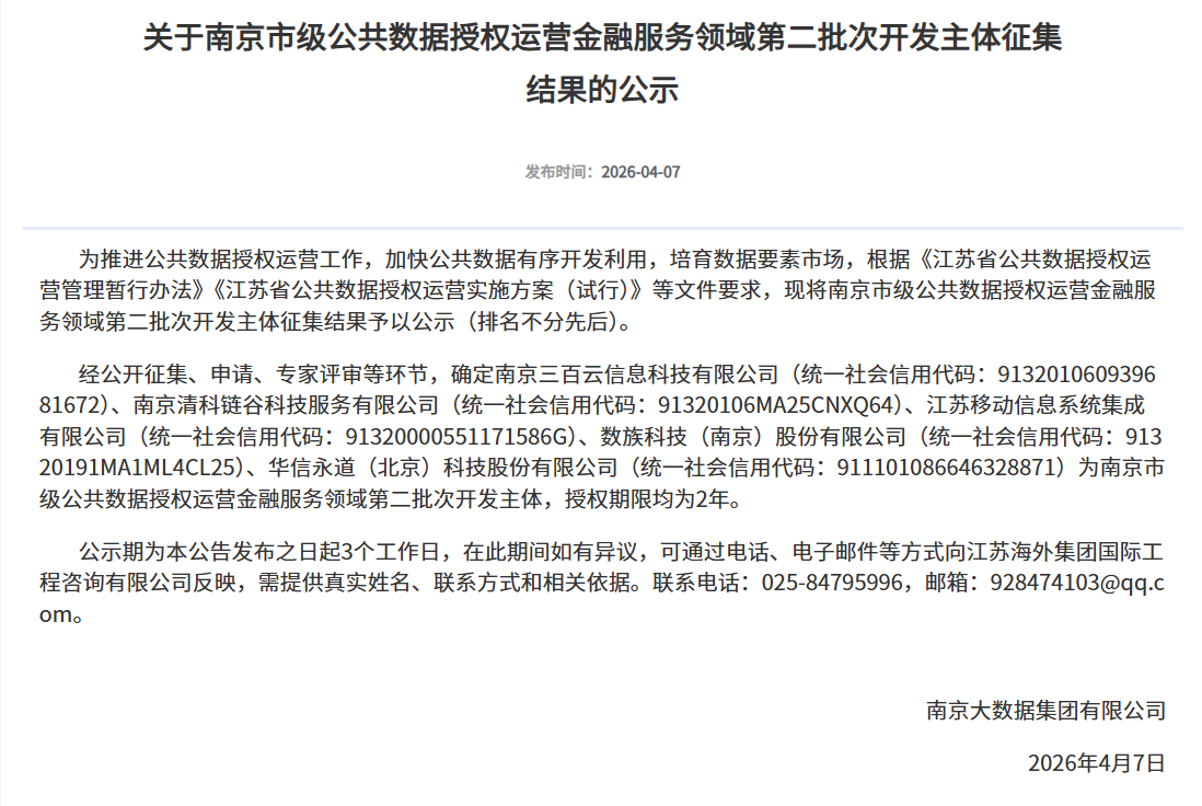 ????產(chǎn)發(fā)集團(tuán)下屬子公司南京市鼓樓高新科技發(fā)展集團(tuán)有限公司,作為江蘇省首批入庫培育數(shù)據(jù)企業(yè),其打造的“區(qū)域‘兩病’人群健康檔案與體檢數(shù)據(jù)融合應(yīng)用”項(xiàng)目,獲評(píng)江蘇省2026年第1批(總第7批)公共數(shù)據(jù)“跑起來”場(chǎng)景實(shí)踐案例,項(xiàng)目產(chǎn)生的三款醫(yī)療領(lǐng)域數(shù)據(jù)產(chǎn)品組合更是省數(shù)交所線上交易的首單實(shí)踐案例。 【南京清科鏈谷科技服務(wù)有限公司】 “南京市級(jí)公共數(shù)據(jù)授權(quán)運(yùn)營(yíng)”金融服務(wù)領(lǐng)域第二批次開發(fā)主體 ????南京清科鏈谷科技服務(wù)有限公司,專注于成為數(shù)據(jù)要素價(jià)值挖掘的專業(yè)服務(wù)商。依托南京數(shù)字經(jīng)濟(jì)先行城市的資源優(yōu)勢(shì),清科鏈谷精準(zhǔn)把握公共數(shù)據(jù)市場(chǎng)化開發(fā)機(jī)遇,聚焦普惠金融領(lǐng)域痛點(diǎn),迫切需要通過公共數(shù)據(jù)授權(quán)運(yùn)營(yíng),打通產(chǎn)業(yè)與金融數(shù)據(jù)融合通道,破解中小微企業(yè)融資難、融資貴及銀企信息不對(duì)稱等問題,構(gòu)建“數(shù)據(jù)-場(chǎng)景-價(jià)值”的完整閉環(huán)。