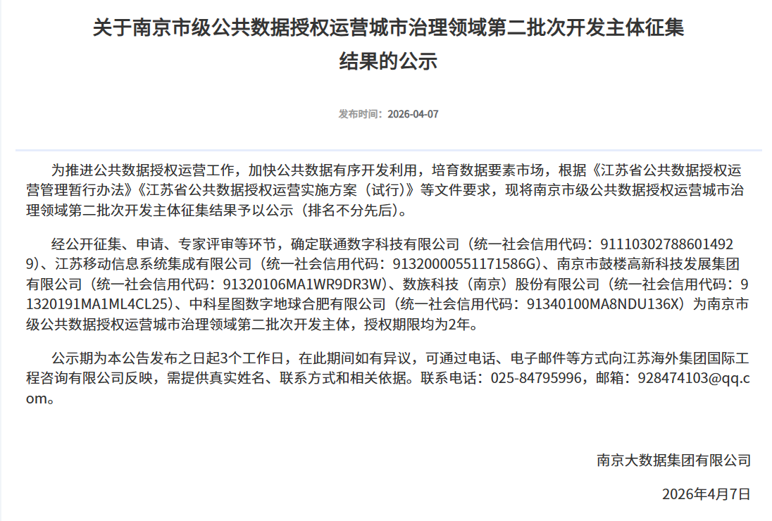 ????近日,南京市公共數(shù)據(jù)授權(quán)運(yùn)營(yíng)城市治理、金融服務(wù)領(lǐng)域第二批開發(fā)主體名單公布,鼓樓區(qū)5家企業(yè)成功入選,數(shù)量位居全市前列,為公共數(shù)據(jù)價(jià)值釋放、培育新質(zhì)生產(chǎn)力再添強(qiáng)勁動(dòng)能。