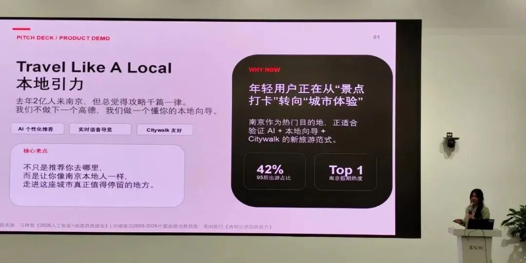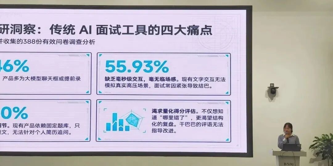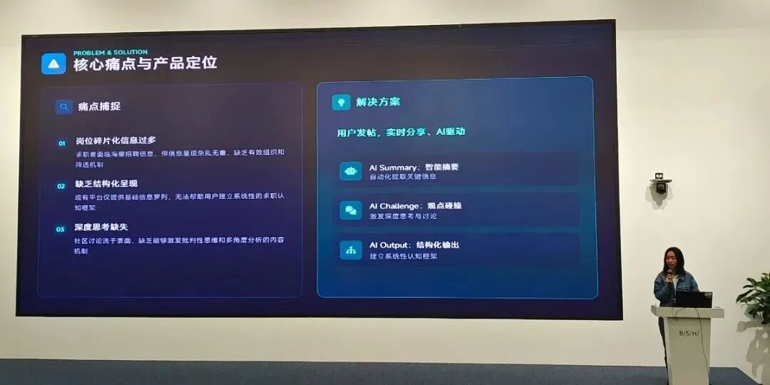 近年來,AI技術呈現出井噴式的發展態勢。博西家電自入駐鼓樓高新區以來,一直深耕家電領域,專注于研發智能化、人性化、高品質的家電產品,并推出了AI家電管家“西西子”與“博世熊”,持續推動行業創新。博西家電人才甄選負責人過穎瑜與博西華電器AI工程師王佳偉,和大家一起進行了創新項目分享,并推介了企業2026戰略實習生項目。從南大到博西家電,用AI課題連接理論與實踐,用戰略視野培養未來人才。 3.項目路演 “求職者社區”“喬治面試”“本地引力”南大“AI+創新創業班”的同學們,帶著他們正在構思的創新項目來到現場,與大家交流分享,暢所欲言。 A.“求職者社區”項目
